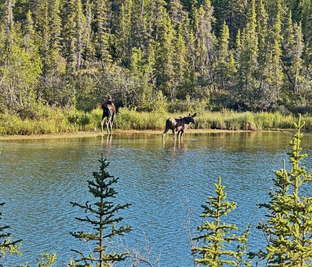 It seems that this was going to be the year of the moose, because there was a cow and a calf having their breakfast around back of the lodge this morning. They were kind enough to stay put for a while, so everyone managed to get a good look and some pictures.
