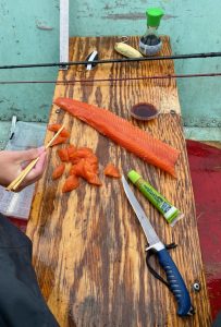 While we, and as it turned out, Charlott and Rohan, didn’t set the world on fire Trout wise Al, with Eric’s able assistance, hit it out of the park at the “Nutsack.” Fishing deeper water and using weights, Al caught 2 – 20’s and 3 – 23’s. Hank and Michael also did very well yet again around the entrance to Beaver Inlet, catching a number in the teens, along with a 20 and 24. They really do have that area locked down.
