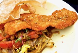 He prepared a medley of stir-fired vegetables with Tikka Masala and lime, together with a seared, Panko/Parmesan encrusted Lake Trout, served with light, crispy Papadum’s.