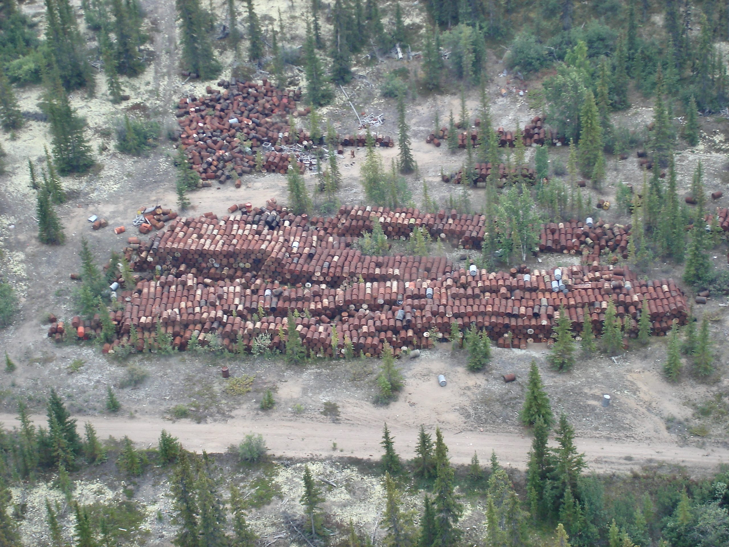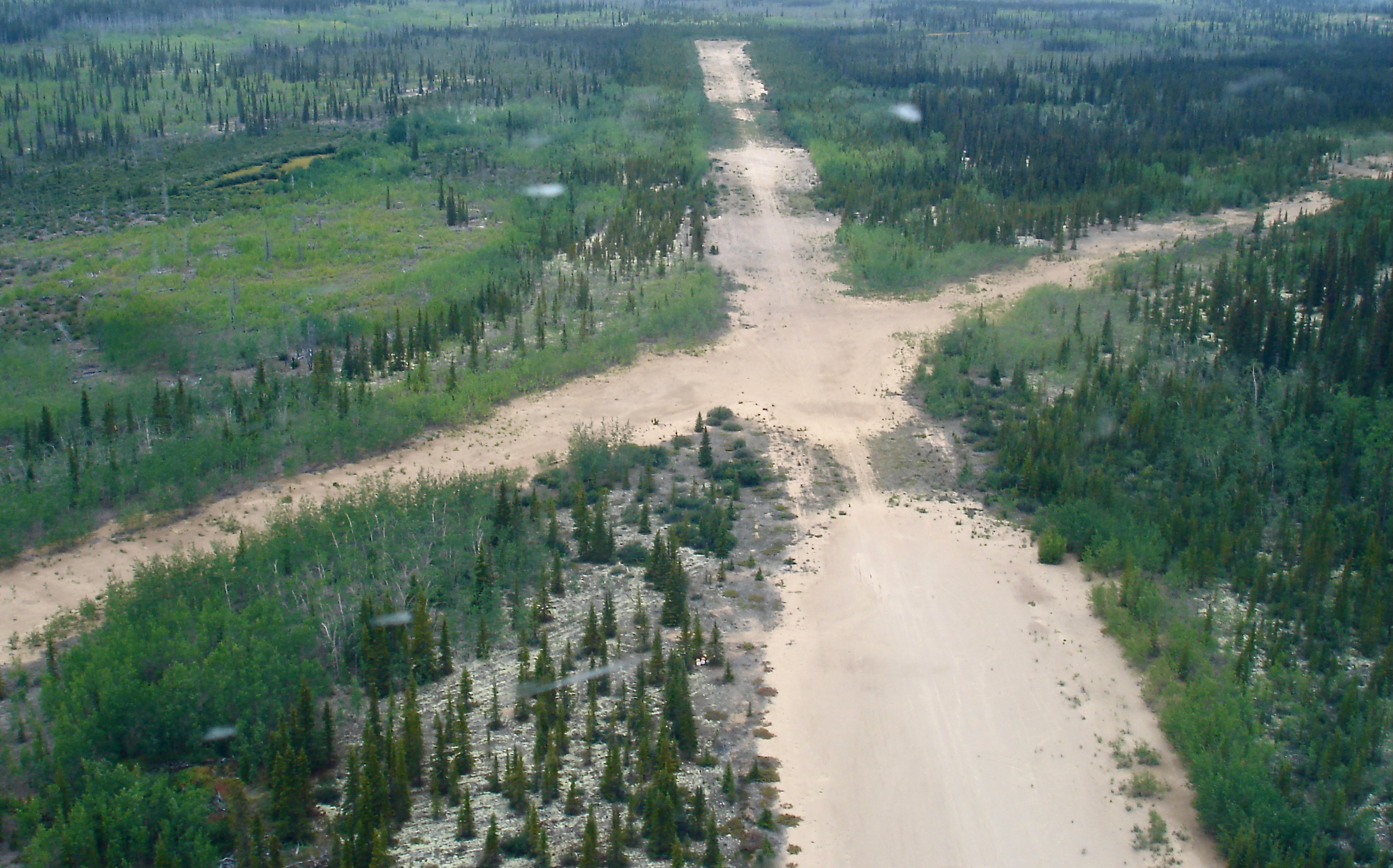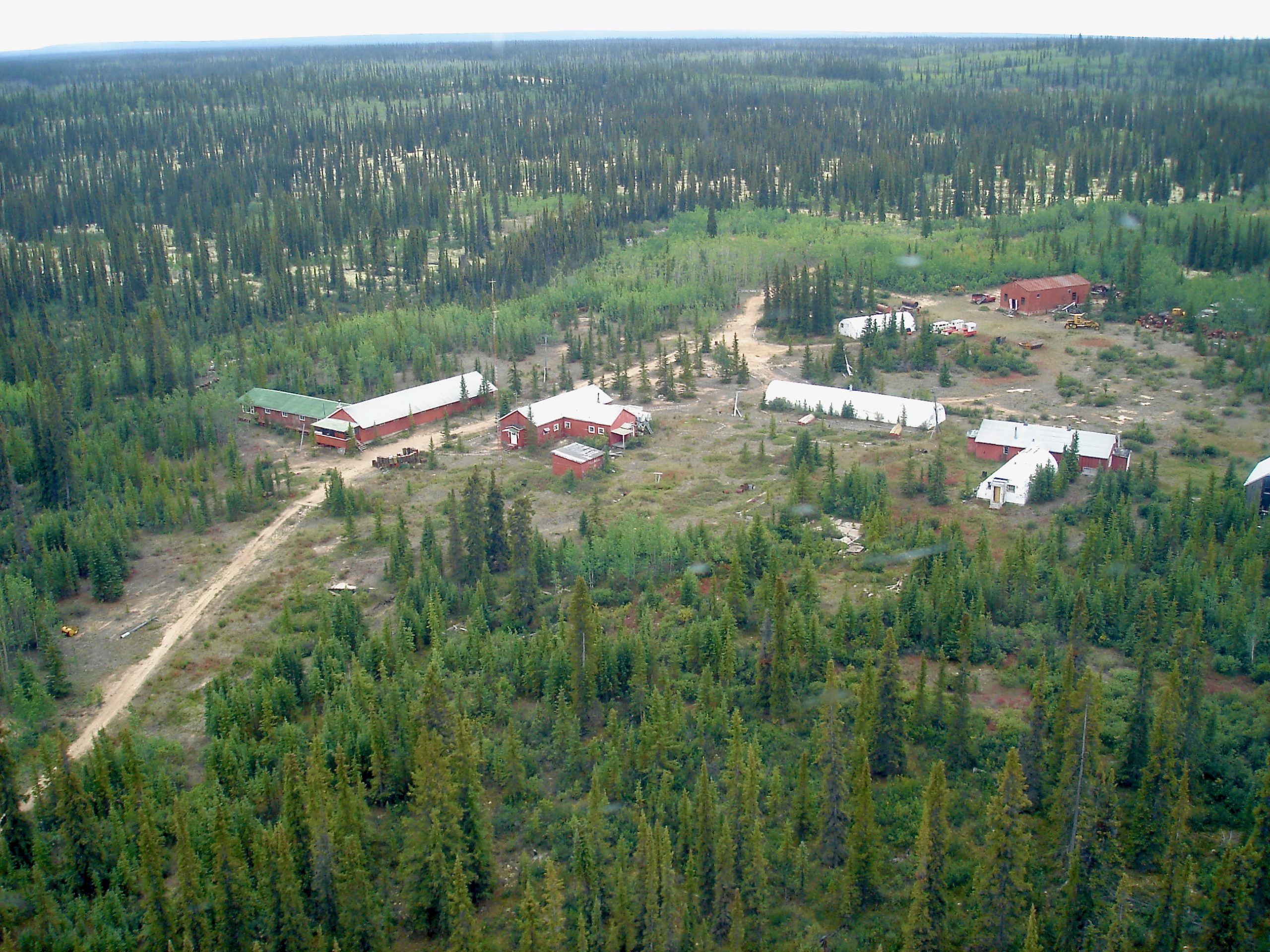 Taken in 2008, there are a series of aerial photographs below that follow the road across the peninsula from east to west, starting from the point where it meets Great Bear just south of Sawmill Bay. The road eventually touches the lake again on the west side of the Leith Peninsula south of Neiland Bay, where Great Bear Lake Lodge once stood.