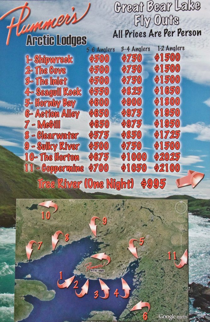 From their original location, for $62 pp you could fly up to the Coppermine, or if you were staying at their Great Slave Lake Lodge, it cost $100 pp for a side trip to Great Bear. Also available from Great Slave, was a side trip to Coppermine, with a stop at Bear. The price was $148 pp., and if you decided to overnight at Bear, accommodation was on offer for $10 pp, per night.